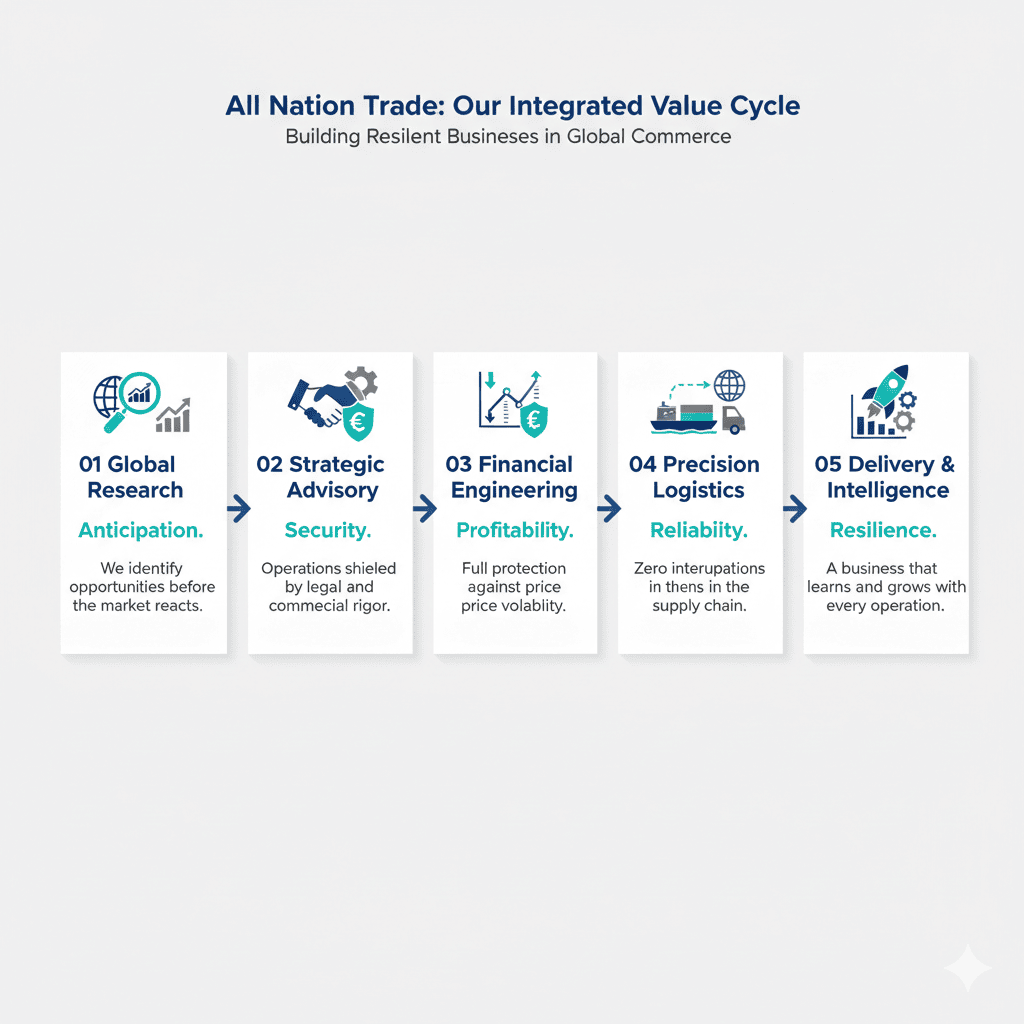 All Nation Trade sources, finances and delivers energy commodities with precision and reliability, helping clients secure supply and optimize market opportunities. By leveraging global networks and local expertise, we bridge producers and consumers to ensure seamless trade, competitive pricing and timely delivery. Our commitment to transparency and compliance fosters trusted long-term partnerships across borders.
